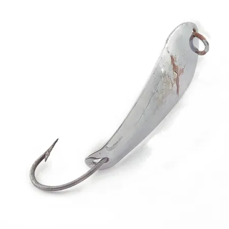 La placcatura in nichel riveste il corpo da 4,5 cm (1 3/4") di questo cucchiaino vintage, che mostra segni di usura coerenti con una valutazione di 3/5. Con un peso di 4,5 g (3/16 oz), il corpo in metallo è punzonato con i marchi identificativi del produttore, che lo confermano come un Barracuda Reflecto #1, codice prodotto 23565. Questo esemplare realizzato negli USA presenta un amo singolo collegato tramite un anellino spaccato in coda, una configurazione robusta progettata per lo spinning o la traina. Sono presenti visibili macchie di ossidazione sulla superficie superiore vicino all'occhiello, sebbene la lucentezza metallica originale rimanga predominante sul resto del corpo. Un singolo anello è montato in testa per un fissaggio sicuro della lenza.