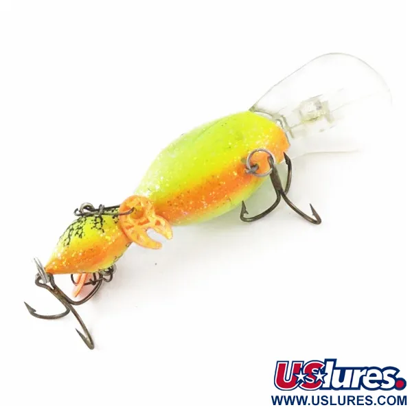 La livrea Fire Tiger con glitter dorati ricopre il corpo a gradini di questo Renosky Lures Guido's Double Image. Con un peso di 9,5 g (1/3 oz) e una lunghezza di 6 cm (2 1/4"), la sua forma insolita è stata progettata da Gabriel "Guido" Renosky per imitare la silhouette di due pesci esca che nuotano insieme. La paletta trasparente di questo modello galleggiante permette di raggiungere profondità tra 0,3 e 1,6 m a lancio, e può toccare i 2,1 m a traina. Piccoli trailer in plastica arancione fissati all'ancoretta ventrale offrono un contrasto aggiuntivo rispetto al ventre chartreuse brillante. I rattle interni aggiungono una componente sonora alla presentazione, efficace con recuperi regolari o stop-and-go. Questo esemplare in condizioni 5/5 mantiene la vivacità originale e il profilo unico, catalogato con il codice 24467.