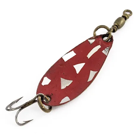 La vernice rossa applicata su una base di nichel definisce il carattere visivo di questa rarità da 1,5 g (3/64 oz), nota ai collezionisti come Roy Self #1. La finitura presenta scaglie di nichel geometriche sparse che interrompono la superficie rossa, un elemento di design classico di Roy Self volto a creare riflessi di luce. Identificabile dal codice prodotto 23043, questo esemplare misura 3,3 cm (1 1/4") e rappresenta un eccellente esempio di artigianato di ondulanti vintage. Sia la testa che la coda sono dotate di anellini spaccati in tonalità ottone; l'anellino superiore ospita una girella a barilotto, mentre quello inferiore monta un'ancoretta. L'esca è in condizioni eccellenti, con una finitura ben conservata e componenti metallici puliti, meritando un punteggio di condizione di 5/5. Le superfici in nichel sul lato posteriore sono lucide e coerenti con la placcatura di alta qualità tipica della produzione di articoli da pesca della metà del secolo scorso.