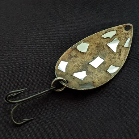 Una forma a goccia ben definita caratterizza questa rarità di produzione americana, che presenta una faccia anteriore dorata intarsiata in modo unico con diversi frammenti di specchio angolari. Sul retro in nichel lucidato è punzonato chiaramente il marchio "ROY SELF" insieme al numero di modello 4. Con un peso di 3/16oz (5g) e una lunghezza di 2" (5cm), la struttura di questo ondulante punta su un'elevata riflessione della luce per diverse profondità. Questo esemplare, registrato con il codice prodotto 22505, mostra lievi segni del tempo che ne sottolineano il carattere vintage, mantenendo uno stato di conservazione pari a 4/5. Un'ancoretta classica rimane fissata tramite un anellino spaccato, abbinata a un semplice foro per l'aggancio del filo all'estremità affusolata.