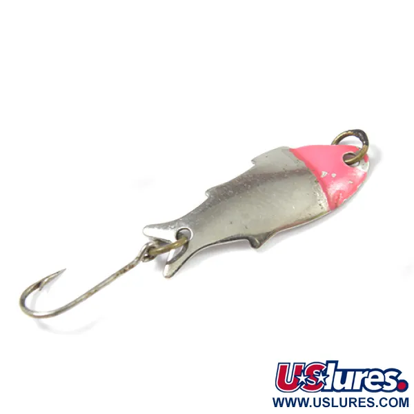 Punzonato direttamente nel metallo sul lato inferiore, il nome Triple Teazer identifica questo classico ondulante di produzione americana di Shoff's. Con una lunghezza di soli 3 cm (1 1/4") e un peso delicato di 1,1 g (1/32 oz), questa piccola esca è stata progettata per la pesca con attrezzatura leggera e ultra-light. Il corpo nichelato presenta una silhouette a profilo di pesce, completa di una distinta pinna dorsale e una coda forcuta. Una vivace macchia di vernice rossa copre la sezione della testa vicino all'occhiello, fornendo un richiamo visivo per i pesci vicini. Fissato tramite un anellino spaccato nella parte posteriore, l'amo singolo rimane pulito e affilato. Prodotto negli USA, questo esemplare riporta il codice prodotto 2171 e mostra una leggera storia d'uso, meritando una valutazione di condizione 4/5. La nichelatura conserva gran parte della sua lucentezza originale, mettendo chiaramente in risalto il testo punzonato che segna l'eredità di Shoff's nel panorama della pesca del Pacifico nord-occidentale.