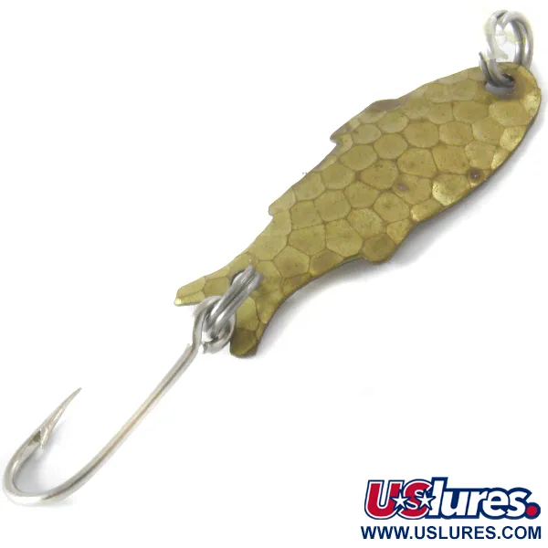 La texture in ottone martellato conferisce un aspetto scaglioso a questo ondulante vintage, aiutandolo a imitare il piccolo pesce foraggio in acque chiare. Con una lunghezza di 1 1/4" (3 cm) e un peso di 1/32 oz (1,1 g), lo Shoff's Triple Teazer è un classico ultra-light proveniente dagli USA. Questo esemplare, con codice prodotto 4099, si presenta in condizioni 4/5 con superfici pulite e pinne stampate ben definite lungo i bordi del corpo a forma di pesce. Presenta split ring argentati sulla punta e sulla coda, abbinati a un amo singolo affilato. La silhouette imita un piccolo minnow, completa di coda affusolata e testa leggermente più larga. La finitura martellata sul davanti crea riflessi di luce sfaccettati, mentre il retro concavo rimane liscio, lasciando intravedere chiaramente il colore originale dell'ottone.