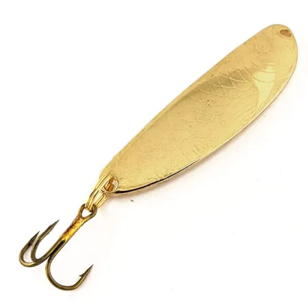 La placcatura in oro conferisce una brillantezza a specchio al corpo da 5,8 cm (2 1/4") di questo classico ondulante da lancio. Con un peso di 9 g (1/3 oz), l'Acme Side-winder S-100 (Codice 12278) presenta incisioni dettagliate a scaglie di pesce e un motivo di branchie stampato sulla faccia convessa. Questo esemplare è in condizioni 5/5, mantenendo una superficie riflettente uniforme sia sul fronte testurizzato che sul retro liscio e lucidato. Prodotto negli USA, la struttura in metallo pieno è completata da un anello spaccato color oro e un amo triplo affilato all'estremità posteriore. Un foro praticato con precisione all'estremità stretta funge da attacco per la lenza, mantenendo il profilo idrodinamico destinato al lancio e alla traina.