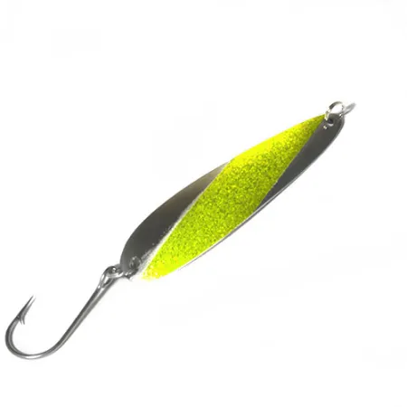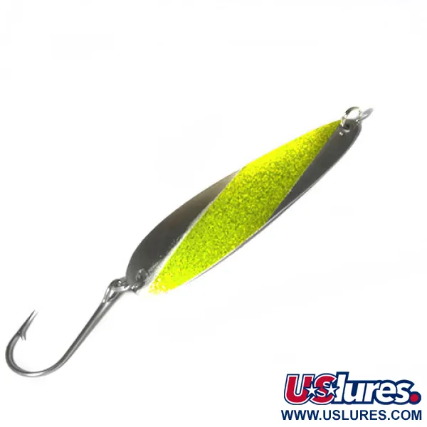 Con un peso di 11,5 g (2/5 oz), questo ondulante Slammer presenta una distintiva striscia diagonale dorata glitterata su un corpo in nichel lucidato. Prodotto negli USA, questo specialista della traina da 9,5 cm (3 3/4") reca il nome del produttore stampigliato sul retro in nichel pulito. Il modello 0480 è armato per lavori gravosi con un singolo amo robusto collegato tramite un anellino spaccato resistente, un assetto preferito dai pescatori dei Grandi Laghi e delle zone costiere per insidiare specie dalla mascella potente. La finitura fornisce un flash ad alto contrasto, combinando la qualità riflettente del nichel con il luccichio materico dell'accento oro-chartreuse. Con un grado di conservazione di 4/5, le superfici metalliche mantengono la loro lucentezza originale e la minuteria rimane salda e funzionale. Progettato specificamente per il passo costante della traina, il profilo allungato e sottile dello Slammer 0480 è sagomato per mantenere la stabilità a varie velocità.