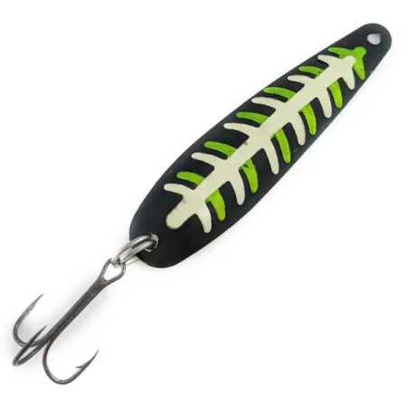 Una finitura nero opaco fa da sfondo a un motivo a scheletro luminescente su questo cucchiaino da 8,5g (1/3oz). Prodotto negli USA, il modello Slammer Glow — codice prodotto 22551 — utilizza una livrea fluorescente ad alto contrasto nei toni del verde e del bianco. Il corpo in metallo da 8,5 cm è in condizioni 5/5, con i dettagli della verniciatura che risultano nitidi e intatti. Sul retro, l'esca presenta un rivestimento fluorescente bianco sporco uniforme per la massima visibilità in acque profonde o torbide. Un singolo anellino split ring collega un'ancoretta con finitura scura alla coda, mentre la testa affusolata è preforata per l'aggancio di una clip o di un terminale. La transizione cromatica tra le sfumature verde neon e la struttura ossea bianca rimane ben definita su tutto l'esemplare.