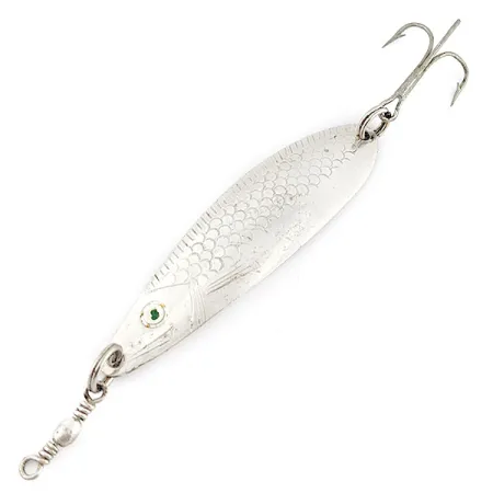 Incisa chiaramente sul retro di questo ondulante da 1/3 oz (10 g), la dicitura "MADE IN NORWAY" identifica un classico dell'artigianato scandinavo firmato Sølvkroken. Lungo 7,5 cm (3"), questo esemplare argentato, identificato dal codice prodotto 23107, presenta una dettagliata trama a scaglie impressa sul metallo della faccia anteriore. Una pupilla verniciata di verde risalta all'interno dell'occhio, offrendo un punto focale discreto sulla finitura metallica lucida. Il lato posteriore riporta il nome del modello "STORLAKSEN" insieme all'iconico logo del pesce che salta del marchio e al timbro del peso. Per quanto riguarda la componentistica, l'esca è dotata di una funzionale girella a barilotto in testa e di un'ancoretta standard in coda. Conservando la sua brillantezza originale, le condizioni di questo pezzo vintage sono valutate 5/5. Questo particolare modello è progettato per lo spinning sia in acqua dolce che in mare, destinato principalmente alla pesca del salmone e delle grandi trote.