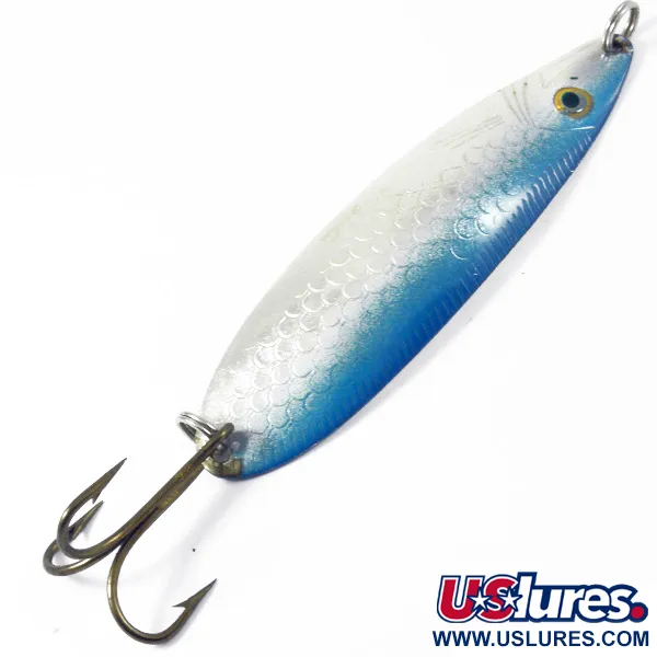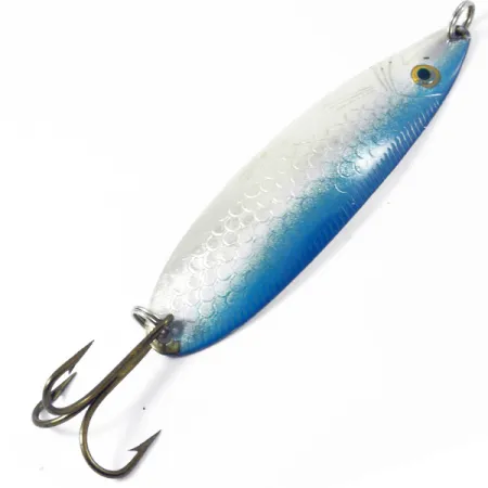 Un motivo a scaglie argentate con un vivace riflesso blu lungo il bordo definisce la finitura di questo classico cucchiaino norvegese. Con un peso di 1/2 oz (15 g), lo Storlaksen è un punto di riferimento per i pescatori che insidiano salmoni e grandi trote, utilizzato principalmente per lo spinning o la traina in acque correnti. Lungo 3 1/2" (9 cm), l'esca presenta l'autentico marchio „Sølvkroken Storlaksen“ profondamente impresso sul retro in argento lucido. Questo specifico esemplare reca il codice 3354 e rappresenta l'alta qualità della lavorazione dei metalli tipica della principale casa di pesca norvegese. La componentistica include un robusto amo triplo con finitura bronzata fissato tramite un solido anello spaccato, garantendo resistenza agli usi gravosi. Lo stato di conservazione è un solido 5/5, con superfici notevolmente pulite e dettagli definiti sul lato texturizzato. Un anello spaccato supplementare in testa fornisce un punto di attacco sicuro per il collegamento diretto della lenza o di una girella.