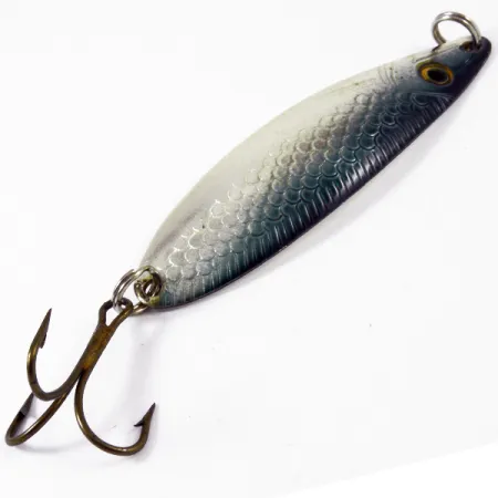 Un classico motivo a squame di aringa adorna il dorso di questo ondulante da 7,5 cm (3"), sfumando da un profondo blu-grigio verso una pancia bianco-argento scintillante. Originario della Norvegia, questo Sølvkroken Storlaksen, identificato dal codice prodotto 3356, rappresenta un caposaldo dell'attrezzatura scandinava per il salmone e la trota di mare. Con un peso di 10 g (1/3 oz), il corpo allungato e leggermente ricurvo è chiaramente punzonato sul retro con il nome del marchio e la scritta 'Norway'. La componentistica è al massimo della forma, con due robusti anellini spaccati e un'ancoretta brunita adatta sia al lancio che alla traina leggera. Un occhio giallo dipinto con pupilla nera sulla testa funge da bersaglio realistico per i pesci predatori. Questo esemplare è in condizioni 5/5, mantenendo la sua lucentezza metallica. Sulla faccia interna argentata, rimane un piccolo punto verde risalente al periodo trascorso nella collezione di un precedente proprietario.