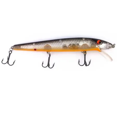 Con un peso di 1/2 oz (13 g), questo jerkbait dal profilo allungato rappresenta la classica maestria artigianale americana legata al marchio Smithwick. Il profilo da 5" (13 cm) è rifinito con una tavolozza ad alto contrasto caratterizzata da dorso nero, fianchi argentati con squame testurizzate e pancia arancione brillante. Grandi occhi rossi traslucidi sono incastonati nella testa, un tratto distintivo della serie Suspending Rattlin’ Rogue. Questo esemplare, con codice prodotto 10889, è in condizioni 5/5 con superfici limpide e componenti metalliche affilate. Il sistema interno di rattle fornisce la firma acustica per cui queste esche sono note. È progettato per restare in sospensione nella colonna d'acqua, raggiungendo profondità da 0,3 m a 2 m a lancio, o scendendo tra 3 m e 4 m a traina. Tre ancorette originali sono assicurate alla parte inferiore, mantenendo il bilanciamento richiesto per il suo assetto neutro.