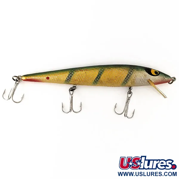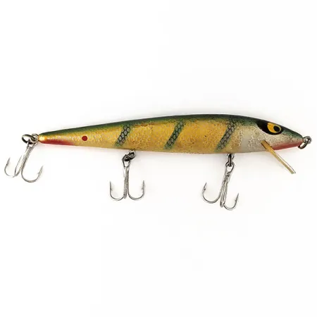 Striature verticali a tema persico su un corpo dorato definiscono l'estetica di questo Smithwick Suspending Rattlin’ Rogue. Identificato dal codice 11173, questo artificiale da 12,07 cm pesa 11,34 g ed è un pezzo di storia dell'attrezzatura americana. La finitura è in condizioni eccezionali (5/5), mettendo in risalto la gola rossa e gli iconici occhi gialli giganti con pupille nere. Progettato come modello suspending con rattle interni, mantiene un assetto neutro nella colonna d'acqua. Raggiunge profondità di 0,3 m - 2 m a lancio e di 3 m - 4 m a traina. La dotazione include tre ancorette e una paletta tonda trasparente.
