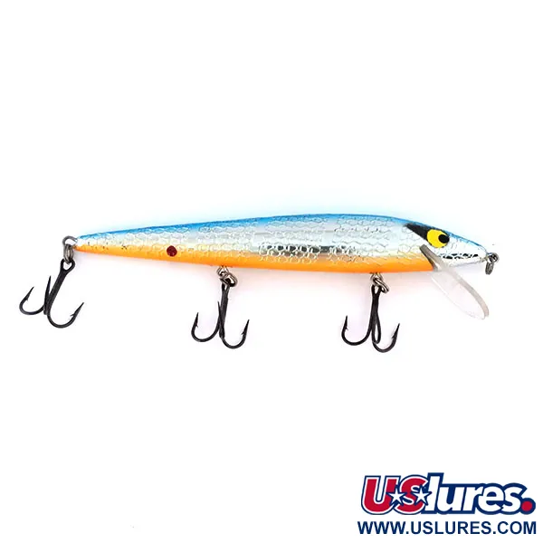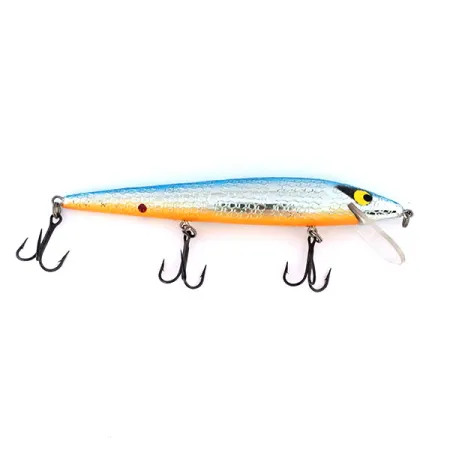 Scaglie d'argento brillanti ricoprono i fianchi di questa jerkbait da 12 cm, sfumando in un blu vibrante lungo il dorso e un ventre arancione acceso. Identificata dal codice 11035, questa Smithwick Suspending Rattlin’ Rogue 12 è un classico esempio di artigianato americano, prodotta negli USA. La testa è caratterizzata da un occhio giallo inserito in una marcatura nera a forma di lacrima, tratto distintivo di questo modello. Un piccolo punto rosso intenzionale è posizionato appena sopra il punto inferiore vicino all'amo di coda, aggiungendo un dettaglio sottile alla finitura metallica. Come modello suspending (ad assetto neutro), questo artificiale da 12g è progettato per rimanere sospeso nella colonna d'acqua durante le pause del recupero. La camera interna con rattle fornisce un profilo sonoro specifico. A seconda della tecnica, la paletta in plastica trasparente permette una profondità di affondamento da 0,3 m a 2 m a spinning, mentre a traina può scendere da 3 m a 4 m. Questo esemplare è in condizioni 5/5, con vernice integra e tre ancorette affilate montate su anellini spaccati originali.