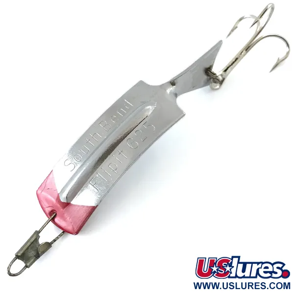 Incise chiaramente sulla superficie in nichel lucido, le scritte "South Bend" e "FLIPIT 625" identificano questo classico americano della metà del secolo scorso. Con un peso di 8,5 g (1/3 oz) e una lunghezza di 6 cm (2 1/4"), questo esemplare presenta una distinta verniciatura rossa sulla punta che crea un netto contrasto con il corpo argentato. Questo particolare artificiale, catalogato con il codice prodotto 5520, esemplifica la lavorazione funzionale del metallo tipica della produzione South Bend negli USA. La struttura è composta da una piastra metallica curva che termina con una pinna caudale rialzata, dove un'ancoretta argentata è collegata tramite un robusto punto di giunzione. Sull'estremità anteriore, un occhiello metallico ospita un connettore a scatto in stile vintage per un armamento sicuro. Le condizioni sono valutate 5/5, con una finitura brillante e riflettente e una vernice ben conservata. La geometria della serie Flipit è stata progettata specificamente per il lancio e la traina, sfruttando il centro zavorrato e l'esclusiva svasatura della coda per mantenere la stabilità durante il recupero nella colonna d'acqua.