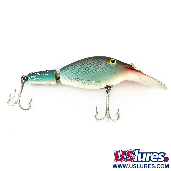 Lungo 8 cm (3 1/4 pollici), questo artificiale Eppinger snodato presenta un distintivo schema a scaglie grigio e azzurro su un ventre bianco crema. Il peso di 10 g (1/3 oz) lo rende una scelta versatile sia per lo spinning che per la traina a lucci, lucioperca o trote. Identificato dal codice prodotto 8108, il nome "SPARKLE TAIL" è stampato chiaramente sul lato, onorando il moniker con una coda infusa di glitter. Una vivace macchia rossa risalta sulla parte anteriore vicino alla paletta in metallo, completata dai classici occhi gialli. Questo esemplare prodotto negli USA è in condizioni 5/5, con una verniciatura straordinariamente pulita e componentistica originale. L'articolazione tra il corpo e la coda è garantita da robusti anelli metallici, assicurando l'integrità strutturale di questo pezzo vintage.