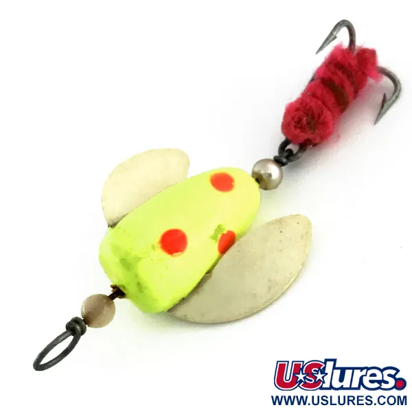 Le proprietà fluorescenti permettono al corpo giallo neon di questo Shur Strike Spin-n-Glo UV di illuminarsi sotto i raggi ultravioletti, accentuato da una serie di puntini rossi brillanti. Questo modello specifico, codice prodotto 9479, dimostra l'attenzione del produttore per una presentazione ad alta visibilità. L'assemblaggio presenta due ali rotanti chiare montate su un corpo cilindrico di 7 cm, supportato da un telaio in metallo centrale. Alla base, una serie di perline metalliche separa il corpo da un'ancoretta guarnita con morbide fibre rosse. Con un peso esatto di 3,6 g, l'esca è conservata in eccellenti condizioni 5/5 senza scheggiature o segni di usura. Questo esemplare vintage proveniente dagli USA evidenzia la classica combinazione di componenti rigidi e terminali guarniti per la massima visibilità in acque profonde.