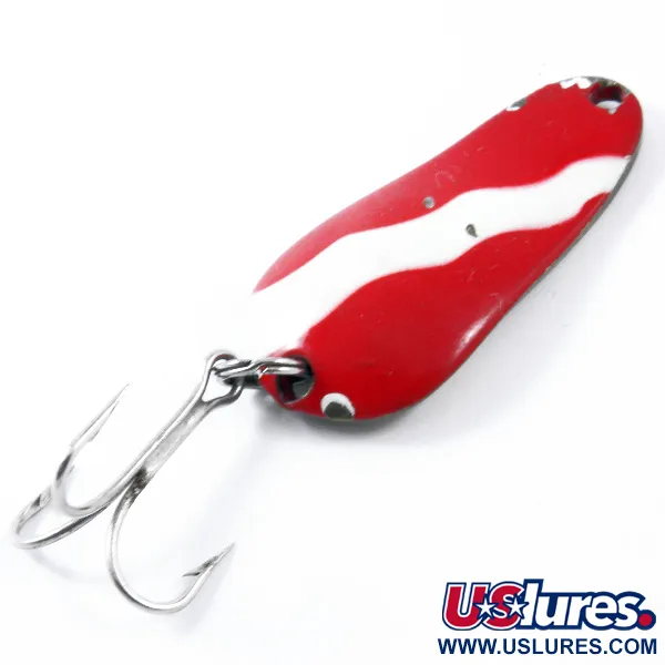 In tonalità ottone e chiaramente stampato, il lato inferiore di questo ondulante riporta la dicitura Spinno-King No 00. Con una lunghezza di 3,5 cm (1 1/2") e un peso di 7 g (1/4 oz), il corpo metallico presenta un motivo a onde rosse e bianche ad alto contrasto sulla superficie anteriore. Questo esemplare, contrassegnato dal codice prodotto 3374, è attribuito a Weller e condivide l'eredità della Pecos River Tackle Co. del New Mexico, USA. La dotazione consiste in un'unica ancoretta fissata alla base. Piccole scheggiature nella finitura smaltata riflettono il tempo trascorso in una scatola porta-esche, risultando in una valutazione dello stato di conservazione di 4/5. Il profilo a goccia e la solida fattura sono segni distintivi delle esche metalliche americane della metà del secolo.