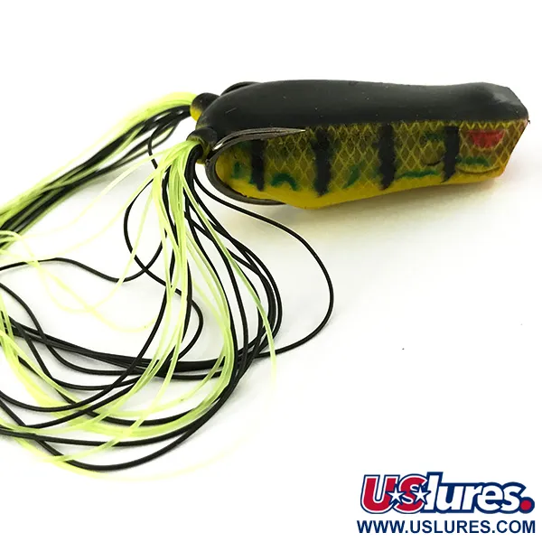 Con un peso esatto di 14 g (1/2 oz), questa esca topwater in livrea Perch presenta fianchi gialli con evidenti barre verticali scure. Lunga 6 cm (2 1/4"), la SPRO Dean Rojas Bronzeye Frog Popper (codice 7148) è dotata di una bocca concava profonda per spostare l'acqua in avanti sulla superficie. Il design a corpo morbido è abbinato a un robusto doppio amo, garantendo che la plastica si comprima facilmente per un'alta percentuale di catture. La gola rosso vivace funge da ulteriore stimolo all'attacco, completata da un lungo gonnellino in gomma in un mix nero e chartreuse. Questo esemplare, di progettazione statunitense, non mostra segni di usura sul corpo o sugli ami (condizione 5/5). Il dorso scuro è una scelta funzionale di Dean Rojas per far risaltare l'esca come una silhouette netta se vista dal basso sotto una fitta vegetazione.
