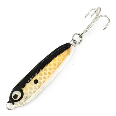 Con un peso di 19g (2/3oz), questo ondulante da lancio prodotto negli USA è un classico esempio del design funzionale firmato Stinger. Il corpo da 5,5 cm (2 1/4") presenta una base distintiva bianca e nera, impreziosita da una trama a nido d'ape color oro-giallo nella parte centrale. Un singolo punto nero ben definito, posizionato appena dietro l'occhio grande, imita i punti di attacco naturali di un pesce esca. Identificato dal codice prodotto 21478, l'esca vanta un profilo aerodinamico progettato per raggiungere grandi distanze nel lancio e per presentazioni in acque profonde. L'armatura è robusta, dotata di uno split ring resistente e un'ancoretta affilata, il tutto con una finitura eccezionalmente pulita. Trovare un esemplare in questo stato di conservazione — valutato 5/5 — testimonia la qualità di questi artificiali vintage. L'occhio bianco e nero sulla parte anteriore aggiunge un tocco di realismo al dorso scuro, che crea un netto contrasto con la pancia argentata lucida.