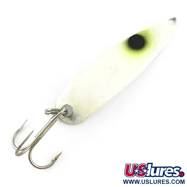 Con un peso esatto di 5 g (3/16 oz), questo ondulante da traina prodotto negli USA rappresenta l'ingegneria di precisione di Advance Tackle. Conosciuto come Stinger Scorpio Glow, codice prodotto 4283, il corpo da 5,5 cm (2 1/4") presenta una faccia bianca evidenziata da un singolo punto nero con un bordo giallo sfumato. La finitura specializzata offre una distinta luminescenza verde punteggiata in ambienti bui, estremamente efficace per la visibilità nelle applicazioni di traina in profondità. Le condizioni sono pari a 4/5, con una finitura pulita e brillante e componenti metalliche ben mantenute. Un'ancoretta affilata è fissata alla coda tramite un robusto anello spaccato.