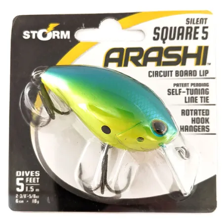 Vivaci tonalità "Parrot" sfumano da un verde lime brillante a un verde acqua profondo sul dorso di questo Storm Arashi Silent Square 5, codice prodotto 11706. Progettato per un contatto preciso con le strutture, l'esca presenta una sottile paletta in circuito stampato (circuit board) studiata per raggiungere una profondità di immersione di 1,5 m. Con un peso di 18 g e una lunghezza compatta di 6 cm, la struttura incorpora un occhiello di aggancio auto-centrante progettato per mantenere l'assetto dritto tra gli ostacoli sommersi. La componentistica consiste in ami VMC montati su occhielli ruotati, che mantengono gli ami più aderenti al corpo per ridurre al minimo gli incagli. Questo esemplare proviene dall'Indonesia nella sua confezione originale ed è inutilizzato. È la versione silenziosa della serie Arashi, che punta sul profilo fisico e sullo spostamento d'acqua anziché sui rattle interni.