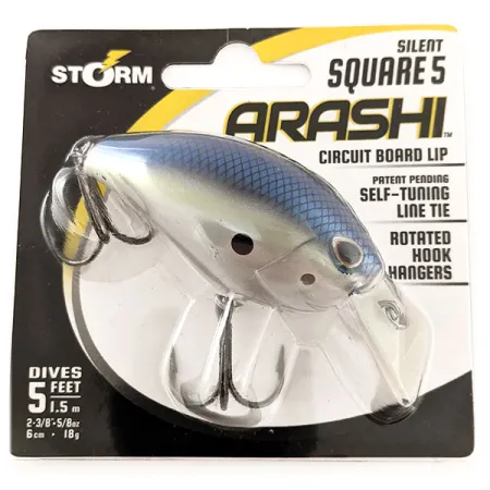 Con un peso di 18 g (5/8 oz), il corpo presenta un dorso a scaglie blu che sfuma in fianchi bianco-argento con una distinta macchia scura. Lo Storm Arashi Silent Square 5, codice prodotto 11951, misura 6 cm (2-3/8") ed è dotato di una sottile paletta in circuito stampato per raggiungere una profondità di 1,5 m (5 ft). Questo crankbait silenzioso utilizza un attacco di lenza auto-centrante, un design a movimento libero concepito per mantenere un nuoto dritto durante il recupero. Per una migliore performance tra gli ostacoli, gli occhielli ruotati permettono alle ancorette VMC di rimanere aderenti al profilo dell'esca, riducendo le possibilità di incaglio. Prodotta in Indonesia, l'esca offre un'azione rolling con un pronunciato movimento della coda. Questo esemplare specifico è inutilizzato ed è classificato come 6.