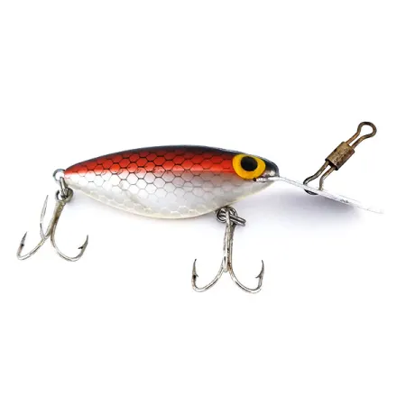 I motivi a scaglie rosse sfumano in un corpo a scaglie argentate su questo classico Storm Original Hot'N Tot. Con un peso di 1/4 oz (6,5 g) e una lunghezza di 2" (5 cm), questo esemplare risale all'era pre-Rapala, quando Storm produceva la serie Thin Fin negli USA. La paletta metallica sovradimensionata è un tratto distintivo del design, progettata per raggiungere profondità di 1,5–4 m (5–13 ft) durante sessioni di traina o casting. Questo specifico artificiale, codice prodotto 9958, presenta distinti occhi gialli con grandi pupille nere che risaltano sulla finitura metallica. Rimane in condizioni 5/5, mostrando componenti ben conservati, inclusi entrambi gli ancorette e la girella con moschettone originale fissata direttamente alla paletta. Originariamente destinato a specie come sandra, pesce persico e luccio, la costruzione del corpo galleggiante è una testimonianza della produzione vintage americana di attrezzatura da pesca.