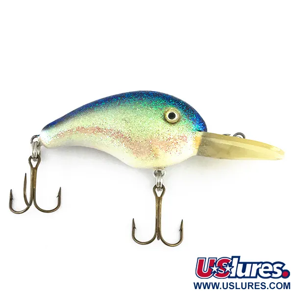 Una trama Green Glitter scintillante copre la parte superiore di questo modello 8017, sfumando dolcemente in un dorso Light Blue e una pancia White solida. Questo crankbait deep-diving di Strike King pesa 10 g (1/3 oz) e misura 5 cm (2"), risultando uno strumento compatto ma capace di raggiungere profondità comprese tra 2,4 e 3,6 m (8 - 12 ft). L'evidente paletta gialla traslucida è progettata sia per il casting che per il trolling, specialmente per insidiare lucci o sandre. Due ancorette con finitura bronzata sono collegate tramite robusti split ring, pronte per l'uso. La camera rattle interna fornisce un profilo sonoro distinto che completa il suo scintillio visivo. Valutato 5/5, la finitura è incredibilmente pulita e la componentistica appare intatta. Occhi bordati d'oro con pupille scure aggiungono un tocco di realismo alla testa di questa esca prodotta negli USA.