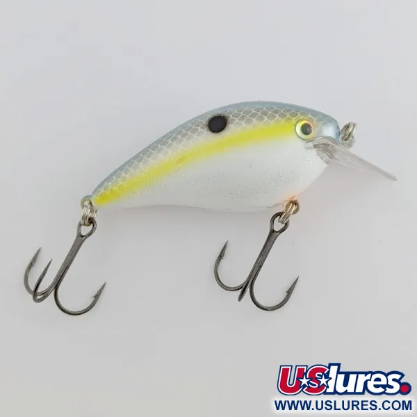 Una paletta quadrata in plastica trasparente definisce il profilo di questo Strike King KVD 1.5 Silent square bill, progettato specificamente per muoversi tra ostacoli e vegetazione fitta. Questo esemplare, con codice prodotto 24437, presenta l'iconica livrea Sexy Shad, caratterizzata da un dorso scagliato grigio-blu scintillante e una vivace linea laterale gialla. Un caratteristico punto nero sul fianco e un sottile accento arancione sulla pancia fungono da stimoli visivi classici per questa colorazione. Trattandosi di un modello Silent, è privo di rattling interni, offrendo una presentazione più naturale per il lancio o la traina in acque pressate. L'esca pesa 3/8 oz (10,6 g) e misura 2 1/2 pollici (63,5 mm) di lunghezza. È progettata per raggiungere profondità comprese tra 0,9 e 1,5 m. L'armamento consiste in due ami ancorini affilati con finitura scura. Questa esca è in ottime condizioni, con una valutazione di 5/5 per la sua finitura pulita e l'aspetto ben curato.
