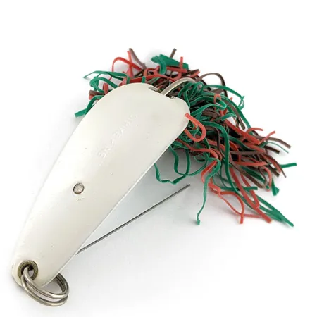 Un corpo in metallo con finitura perlata dal peso di 1/2 oz (14 g) caratterizza questo esemplare di Strike King Timber King. Con una lunghezza di 2 1/4" (5,5 cm), l'esca presenta il nome del produttore chiaramente impresso sulla superficie superiore. Per pescare in zone con vegetazione fitta, il design include un ferretto antialga fisso che protegge un amo singolo integrato nel corpo tramite un sistema di montaggio a vite. La sezione caudale è dotata di un folto skirt in gomma composto da filamenti rossi, verdi e marroni. Valutata 5/5, l'esca presenta una finitura eccellente e componenti in gomma ancora flessibili. Ogni dettaglio, dal robusto split ring di testa alla componentistica inferiore, riflette la sua produzione originale negli Stati Uniti. Questo specifico articolo è catalogato con il codice prodotto 21094.