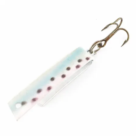 Una caratteristica curvatura a forma di "U" definisce il profilo di questo artificiale metallico, un design che ha reso il Luhr Jensen Super-Duper un elemento indispensabile nelle scatole da trota da decenni. Con una lunghezza di 3,5 cm e un peso di 4,3 g (1/8 oz), questo specifico Super-Duper 503 è identificato dal codice prodotto 24244. La livrea è una fedele riproduzione di una trota iridea, con una delicata striscia rosa lungo il fianco, il dorso di un pallido blu ottanio e una serie di macchie scure su una base bianco crema. Questa struttura non convenzionale è progettata per far presa sull'acqua, producendo un movimento di nuoto efficace sia a lancio che a traina con attrezzatura leggera. La componentistica consiste in un singolo anellino spaccato collegato a un'ancoretta bronzata. Questo esemplare è in ottime condizioni, con la vernice e il metallo che mostrano pochissimi segni di usura, meritando una valutazione dello stato di 5/5.