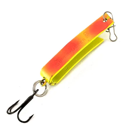 Le proprietà fosforescenti definiscono la finitura di questo South Bend Super-Duper 503 UV, rendendolo una scelta specializzata per acque profonde o giornate nuvolose. Identificato dal codice prodotto 12421, questa esca presenta un esclusivo corpo in metallo piegato a U che combina le caratteristiche di un rotante e di un ondulante. La verniciatura vivace passa da un chartreuse brillante a un arancione saturo, con il rivestimento UV-reattivo che garantisce un'elevata visibilità in condizioni di scarsa illuminazione. Questo particolare esemplare è inutilizzato, in condizioni immacolate con la finitura originale di fabbrica e i marchi stampati integri. Un affilato amo triplo nero è collegato alla coda tramite un anellino spaccato, mentre un moschettone a filo è pre-assemblato sulla testa per un facile fissaggio della lenza.