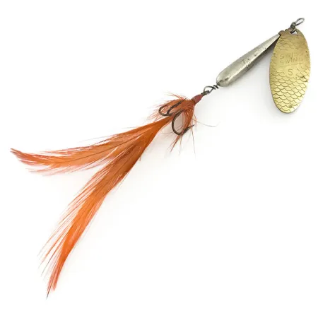 Con una lunghezza totale di 8 cm (3 1/4"), la paletta in ottone con motivo a scaglie offre una trama distintiva che cattura la luce in modo diverso rispetto a una finitura liscia. Una piuma di hackle arancione brillante è legata meticolosamente attorno all'ancoretta di questo esemplare di fabbricazione francese, catalogato con il codice prodotto 9438. Il corpo a goccia nichelato fornisce il peso di 9 g (1/3 oz) necessario per lanci stabili. Renosky Lures ha portato questi design europei sul mercato e la paletta è chiaramente marchiata con l'identificativo 'Swiss Swing 5', mostrandone l'eredità. Ogni componente rimane in condizioni eccellenti, con le superfici metalliche e le piume che appaiono molto ben conservate, meritando un punteggio di 5/5. La struttura in filo è dritta e il cavallino permette alla paletta in ottone di posizionarsi correttamente contro il corpo in nichel.