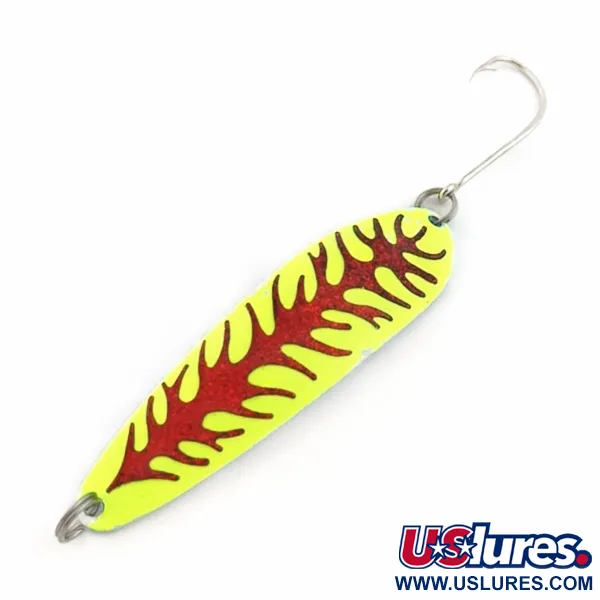 Il giallo chartreuse brillante funge da base ad alta visibilità per la distintiva grafica a glitter rossi su questo cucchiaino ondulante da casting di produzione americana. Con una lunghezza di 9 cm (3 1/2") e un peso di 8 g (1/4 oz), il Producers Hookster Totem #4 rappresenta un'epoca specifica dell'artigianato statunitense del marchio Producers. L'esemplare presenta un motivo rosso intenso, simile a una spina dorsale, con una finitura metallica scintillante che contrasta nettamente con il corpo giallo a tinta unita. Identificata dal codice prodotto 23795, questa esca è in condizioni 5/5, mantenendo una superficie pulita e componentistica originale. La sua configurazione include un amo singolo in acciaio inossidabile fissato tramite un anellino spaccato nella parte posteriore, con un corrispondente anellino in punta per un collegamento sicuro della lenza. Il profilo sottile è progettato per un uso versatile in applicazioni di casting o traina in diverse condizioni di luce.