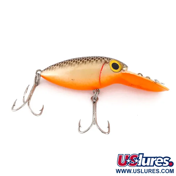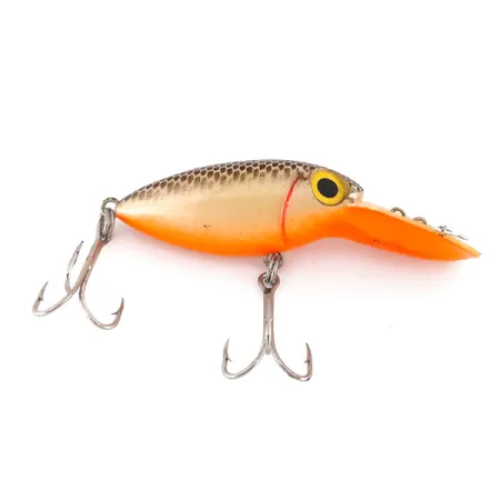 L'arancione domina la metà inferiore di questo esemplare, fondendosi in una livrea a scaglie argento e oro splendidamente realizzata sul dorso arcuato. Questo Willy’s Worm, prodotto da The Producers negli USA, riporta il codice prodotto 9588 ed è in condizioni 5/5. Con una lunghezza di 2" (5 cm) e un peso di 1/4 oz (8 g), l'esca presenta una distintiva paletta sovradimensionata progettata per il deep-water. I grandi occhi gialli con pupille nere prominenti sono un tratto distintivo di questo modello, offrendo un punto focale audace rispetto alla texture delle scaglie. La componentistica originale include due ancorette con finitura argentata, una montata in pancia e una in coda. Un moschettone pre-montato sulla paletta larga e arrotondata assicura l'integrità del prodotto originale. Il passaggio dal ventre arancione brillante al dorso metallico più scuro riflette l'alta qualità costruttiva dell'epoca.