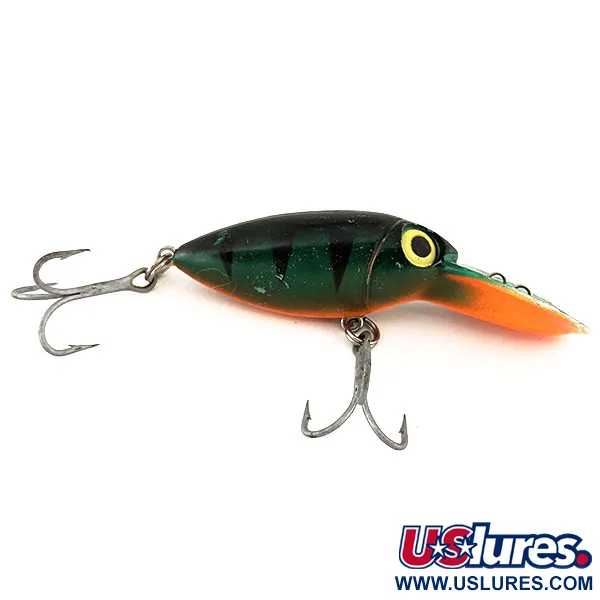 Strisce verticali verdi su un dorso oliva scuro definiscono il profilo visivo di questo The Producers Willy's Worm UV, una rara esca classica di produzione americana. Con un peso di 8 g (1/4 oz), questo esemplare da 5 cm (2") presenta una pancia arancione vibrante che si estende in avanti per formare l'ampia paletta direzionale integrata. Gli occhi gialli con pupille nere offrono un netto contrasto visivo rispetto alla testa verde. Catalogata con il codice prodotto 11232, questa esca si distingue per la sua finitura UV-reattiva sulle strisce, progettata per catturare la luce in varie condizioni d'acqua. L'hardware è composto da due ancorette in ottime condizioni. La transizione della vernice tra il dorso verde intenso e il ventre arancione brillante rimane netta, contribuendo a una valutazione dello stato di 4/5. Ogni dettaglio, dalla forma arrotondata del corpo alla posizione degli occhi, riflette il design tipico di The Producers.