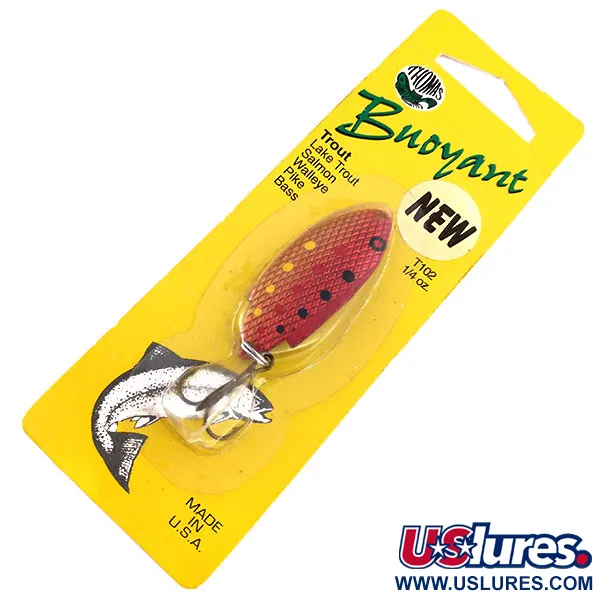 L'ottone placcato oro costituisce la base per la dettagliata finitura Red Trout di questo ondulante da 7 g (1/4 oz). Mai utilizzato e conservato nel suo blister originale a cartoncino giallo, questo esemplare testimonia i tradizionali standard produttivi americani della Thomas Spinning Lures, Inc. con sede a Hawley, PA. Il pattern è composto da una trama a scaglie rosso scuro punteggiata da macchie nere e gialle, studiata per replicare l'aspetto di una piccola trota. Identificato con il codice prodotto 10282, l'imballaggio riporta anche il numero di articolo T102GR, che denota la combinazione di colori oro e rosso. Un'ancoretta in argento brillante è collegata tramite un anellino spaccato alla coda, mantenuta nelle stesse condizioni in cui è uscita dalla fabbrica. I pescatori utilizzano gli artificiali Thomas Buoyant da decenni per insidiare specie come salmone, lucioperca e luccio in vari ambienti fluviali e lacustri. Le istruzioni dettagliate sul retro suggeriscono di lanciare leggermente a monte o direttamente di traverso rispetto alla corrente per gestire la profondità durante il recupero.