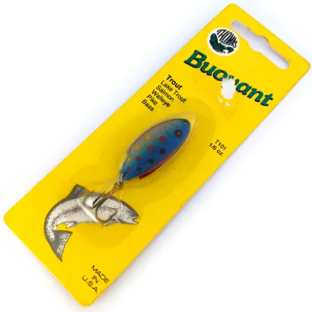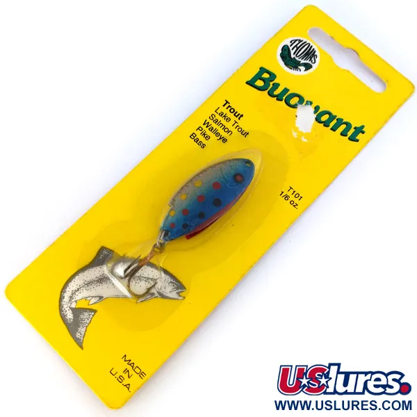 Vivaci punti rossi, gialli e neri punteggiano la finitura Trota Blu (Blue Trout) di questo ondulante in metallo da 4 cm (1 1/2"). Questo Thomas Buoyant, identificato dal codice prodotto 10659, pesa 5 g (3/16 oz) e riflette un design storico che risale al brevetto del marchio del 1946. L'azienda Thomas Spinning Lures, con sede a Hawley, PA, si è concentrata sulla placcatura di qualità orafa per creare un riflesso ad alto contrasto. Come esemplare inutilizzato, l'esca mantiene la sua lucentezza originale di fabbrica senza alcun segno di usura. La dotazione prevede un'ancoretta singola ed è destinata a varie tecniche, tra cui il lancio per la trota o la traina per il salmone e il luccio. Dettagliata sul suo cartoncino giallo originale, l'esca rimane montata sopra la classica illustrazione della trota che salta.