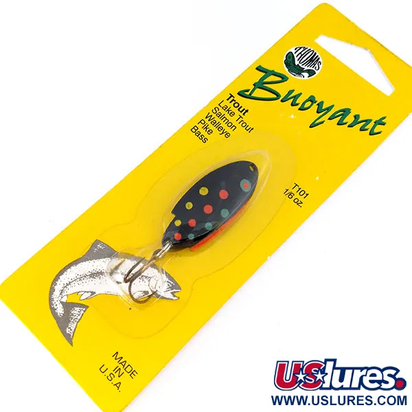 Vivaci punti rossi, gialli e verdi applicati su uno smalto nero profondo definiscono il pattern Black Trout di questo ondulante da 4 cm (1 1/2"). Questo Thomas Buoyant, codice prodotto T101B, pesa 5 g (3/16 oz) e rappresenta un classico per i pescatori di trote, salmoni e lucioperca. Prodotto negli USA, l'esca presenta un corpo metallico dalla forma distintiva, ideale per lo spinning o la traina in varie condizioni d'acqua. La minuteria è fissata tramite un anello spaccato, abbinato a un'ancoretta affilata originale di fabbrica. L'esemplare è nuovo, esattamente come uscito dalla fabbrica in Pennsylvania. Il cartoncino originale include istruzioni specifiche per la pesca in fiume e lago, raccomandando un recupero lento per garantire il movimento desiderato.
