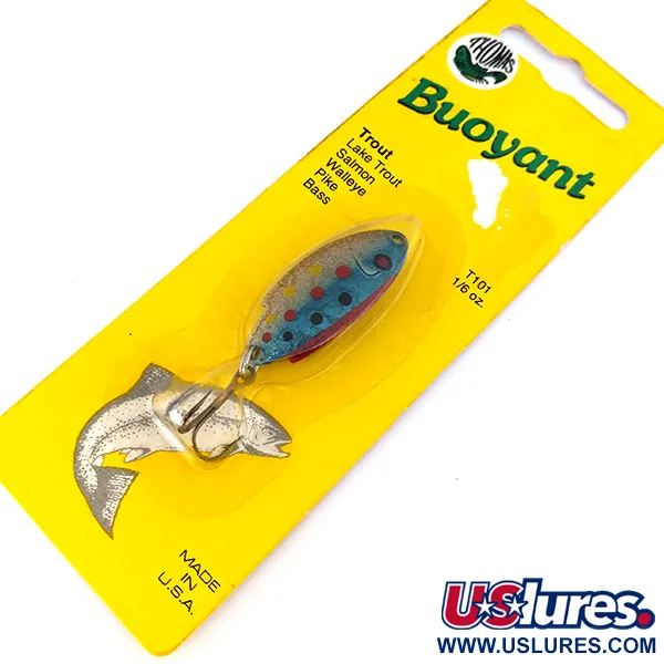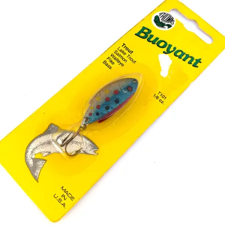 Caratterizzato da una finitura Blue Trout con vivaci puntini rossi e blu, questo cucchiaino da 5 g (3/16 oz) rappresenta un classico dell'attrezzatura da pesca americana. Lungo 4 cm (1 1/2"), l'ondulante presenta una singolare forma a pesciolino stampata con una curvatura specifica per riflettere la luce. Questo esemplare reca il codice prodotto 10661 ed è nuovo, conservato nel suo blister giallo originale. Thomas Spinning Lures brevettò questo design nel 1946 e la sua popolarità tra i pescatori di trote e salmoni deriva dalla finitura di qualità orafa. Il retro della confezione ne evidenzia l'efficacia per specie come il sandra e il luccio se recuperato a velocità moderatamente lenta. Prodotto negli USA, l'esca è armata con un robusto amo triplo. Un adesivo di fabbrica sul retro identifica la variante T101B-BB, confermando la combinazione cromatica argento e blu.