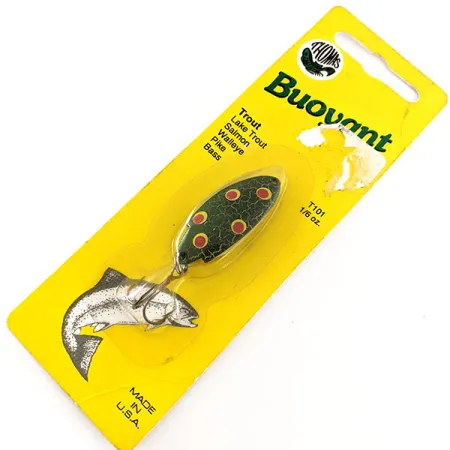 Lungo esattamente 4 cm (1 1/2"), questo ondulante è rifinito nella caratteristica colorazione Red Dot Frog, con una superficie screziata verde scuro, riflessi dorati e vivaci punti rossi. Questo esemplare, identificato dal codice prodotto T101FRG, è conservato nella sua confezione originale vintage in blister giallo e non è mai stato usato. Con un peso di 4,7 g (1/6 oz), l'esca fa parte di una serie che risale a un brevetto statunitense del 1946. Il corpo in metallo stampato è progettato per l'efficacia in torrenti o laghi insidiando trote, salmoni e walleye. Secondo le istruzioni originali sul retro, si raccomanda un recupero da lento a moderato sia per lo spinning che per la traina. La finitura di qualità orafa rimane brillante e il cartoncino originale lo certifica come prodotto genuino Made in U.S.A. della Thomas Spinning Lures, Inc. Il retro della confezione include anche raccomandazioni specifiche per la minuteria, come l'uso di un moschettone Duo-lock o di un nodo a cappio per consentire all'esca di raggiungere la profondità prevista.