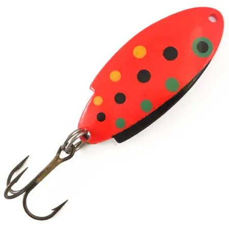 Stampate direttamente nel metallo sul lato bianco perlato, le marcature identificano questo esemplare da 3/16 oz (5 g) come un autentico Thomas Buoyant prodotto negli USA. Con una lunghezza di 1 1/2" (4 cm), l'ondulante presenta l'iconico pattern Red Trout sulla faccia convessa, composto da punti gialli, neri e verdi stratificati su una base rossa solida. Questo particolare artificiale, con codice prodotto 4767, è conservato in condizioni 5/5 con una finitura pulita sia sul lato rosso primario che sul dorso bianco perlescente. Thomas ha scelto un classico profilo a goccia per questo modello, abbinato qui a un amo triplo con finitura bronzata e un robusto anello spaccato. Questi ondulanti sono tradizionalmente utilizzati per lo spinning in torrente o la traina nei laghi, dove il peso di 5 g garantisce una massa sufficiente per lanci precisi e il controllo della profondità.