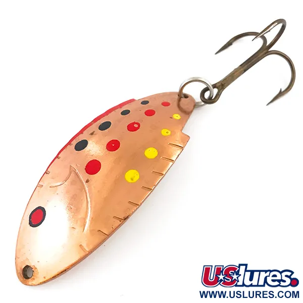 Chiaramente stampigliato sul retro del corpo metallico curvo, il marchio 'THOMAS BUOYANT' e la dicitura 'PAT PEND' identificano questo cucchiaino da 6 cm come un pezzo fondamentale della storia dell'attrezzatura americana. La calda base in rame è decorata con una serie di vivaci punti rossi, neri e gialli, uno schema cromatico classico progettato per un'elevata visibilità in diverse condizioni d'acqua. Con un peso di 14 g, la struttura robusta del cucchiaino è abbinata a caratteristiche tacche lungo un bordo che riproducono la silhouette di una pinna dorsale. La componentistica comprende un robusto anellino spaccato e un'ancoretta bronzata, entrambi strutturalmente integri. Valutata con una condizione di 5/5, la parte anteriore dell'esca si presenta splendidamente con una verniciatura nitida, mentre il retro mostra alcuni leggeri segni superficiali e piccole macchie del tempo che ne attestano lo stato vintage. Questo esemplare prodotto negli Stati Uniti mette in mostra gli standard di produzione durevoli tipici del marchio Thomas.