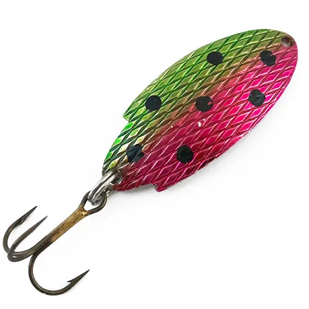 La stampigliatura sul retro in nichel lucido identifica chiaramente questo esemplare come il Thomas Buoyant T101, un design classico originario degli USA. Con una lunghezza di 4 cm (1 1/2") e un peso di 5 g (3/16 oz), questo ondulante presenta una superficie con goffratura a diamante che crea un realistico effetto scaglie. Questa specifica unità, identificata dal codice prodotto 5006, sfoggia la livrea Rainbow Trout con la sua caratteristica sfumatura da verde a rosa e netti punti neri. La componentistica include un robusto anellino spaccato e un'ancoretta affilata, a dimostrazione delle condizioni 5/5 dell'esca. I pescatori utilizzano tipicamente questo peso per lo spinning leggero in torrente o lago alla ricerca di trote e persici. Il profilo concavo del corpo metallico è progettato per spostare efficacemente l'acqua durante un recupero costante. Ogni dettaglio, dalla verniciatura vibrante all'incisione nitida sul retro, riflette gli standard qualitativi della Thomas Spinning Lure Company.