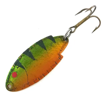 Con un peso di 5g (3/16oz), questo esemplare presenta la classica forma a cucchiaino che ha reso le esche Thomas un punto di riferimento per la pesca alla trota da decenni. La vivace colorazione Fire Tiger è applicata su una superficie testurizzata sul lato anteriore, passando dal verde all'arancione con marcate barre verticali e un singolo occhio rosso. Il retro è rifinito in oro lucido, chiaramente stampato con il marchio Thomas, il modello Buoyant e la sigla T101. Con una lunghezza di 4cm (1 1/2"), il profilo imita fedelmente un piccolo pesce esca, rendendolo una scelta versatile per il lancio in torrenti o laghi. Questo ondulante prodotto negli USA, catalogato con il codice prodotto 5359, è in condizioni 5/5, con minuteria e anellini spaccati mantenuti eccezionalmente bene. Il design presenta un corpo leggermente arcuato studiato per il lancio e recupero in vari ambienti d'acqua dolce.