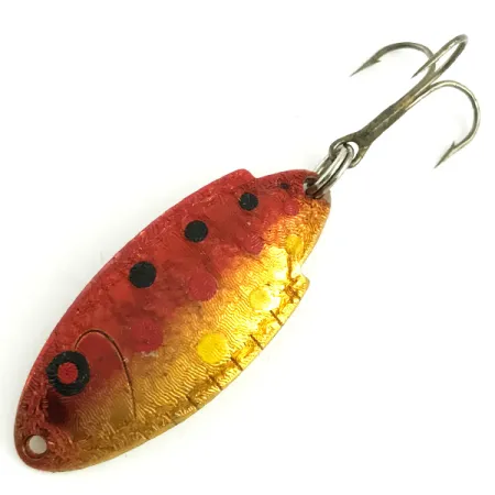 Tonalità dorate abbinate a un vivace motivo a trota rossa definiscono l'estetica di questo ondulante vintage Thomas Buoyant. Contraddistinto dal codice prodotto 5820, l'esca misura esattamente 1 1/2" (4 cm) e pesa 3/16 oz (5 g). La finitura è un dettagliato Golden Rainbow Red Trout, caratterizzato da una metà superiore rosso intenso con puntini neri e una metà inferiore dorata testurizzata con puntini gialli. La componentistica è notevolmente pulita, con l'ancoretta e l'anellino spaccato originali. Sul retro, la superficie color ottone è profondamente punzonata con 'THOMAS', 'T101', 'BUOYANT' e l'indicazione di peso '1/6 oz', una variazione comune in questi pezzi vintage punzonati a mano. Le condizioni sono 5/5, con vernice preservata e scritte chiare e leggibili. Prodotto dalla Thomas Spinning Lure Co. negli USA, il corpo presenta una sottile trama a scaglie incisa nel metallo per aumentare la visibilità nella colonna d'acqua. Un piccolo dettaglio dell'occhio con centro rosso è posizionato vicino all'occhiello, completando il profilo visivo di questo classico artificiale da lancio.