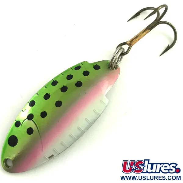 Con un peso di 3/16 oz (5 g), questo ondulante di fabbricazione americana presenta una classica finitura Trota / Argento che imita l'aspetto di una piccola trota iridea. Il corpo da 1 1/2" (4 cm) è meticolosamente punzonato con il nome Thomas Buoyant e le informazioni sul brevetto sul lato inferiore in argento lucido. La faccia convessa è decorata con un dorso verde vivido e vivaci punti neri, separati da una morbida striscia laterale rosa. Classificato con una condizione di 5/5, la vernice rimane nitida e il metallo brillante su tutto il telaio asimmetrico. Lungo il bordo sono visibili distintive dentellature simili a scaglie, un dettaglio tecnico progettato per aumentare la riflessione della luce durante il lancio o la traina. L'esca è armata con un robusto anellino spaccato e un affilato ancoretta bronzata. Contraddistinto dal codice prodotto 5822, questo esemplare è un esempio ben conservato dell'artigianato tradizionale degli Stati Uniti.