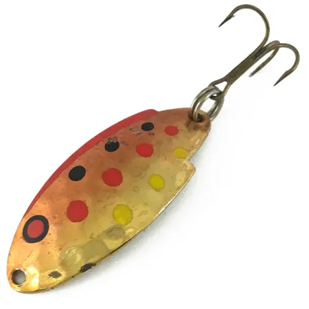 L'ottone dorato martellato crea una superficie altamente riflettente per la colorazione Hammered Golden Rainbow Trout, accentuata da vivaci punti rossi, gialli e neri. Questo ondulante prodotto negli USA, codice prodotto 6824, è conservato in condizioni 5/5 e non mostra segni di utilizzo in pesca. Con una lunghezza di 4 cm (1 1/2") e un peso di 5 g (3/16 oz), il corpo metallico presenta una caratteristica curvatura a goccia e una finitura testurizzata per massimizzare i bagliori durante il lancio o la traina. Il retro è chiaramente stampato con il marchio Thomas, il numero di modello T101 e il nome Buoyant. È dotato di un robusto anello spaccato e di un'ancoretta bronzata, mantenendo tutta la componentistica originale in eccellente stato.