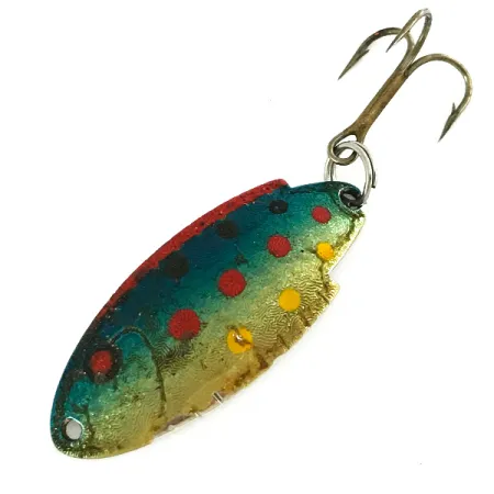 Sulla parte posteriore argentata lucida sono chiaramente impresse le parole "THOMAS BUOYANT", che identificano l'eredità di questo artificiale da 4 cm (1 1/2"). Questo specifico esemplare, catalogato con il codice prodotto 7226, presenta la finitura Blue Trout, un motivo dettagliato con una sfumatura dal verde acqua all'oro punteggiata da distinti punti rossi e gialli. Con un peso di 5 g (3/16 oz), lo spoon rappresenta la classica costruzione di attrezzatura made in USA. L'hardware è composto da un amo triplo bronzato e un robusto anellino spaccato in metallo. Mantenendo una valutazione di 5/5, la vernice rimane eccezionalmente brillante e i dettagli tecnici impressi sul retro in metallo sono perfettamente leggibili. Una sottile linea di vernice rossa traccia il bordo superiore dello spoon, fornendo un netto contrasto con le tonalità blu e verdi del corpo principale.