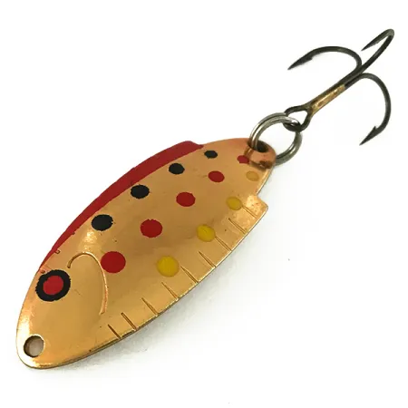 La brillante placcatura in rame funge da base per la finitura Golden Trout di questo modello T102, caratterizzato da distintivi punti rossi, gialli e neri sulla superficie. Sul retro sono impressi chiaramente i dettagli del produttore "THOMAS BUOYANT" e il peso di 1/4 oz (7 g), che lo identificano come un autentico articolo da pesca prodotto negli USA. Questo esemplare, con codice prodotto 7228, misura esattamente 4,5 cm (1 3/4") di lunghezza ed è in condizioni superbe (5/5), senza segni di usura sul metallo lucido o sull'ancoretta originale. Il design include un'area branchiale intagliata vicino alla coda e un profilo curvo che ha reso questa esca un classico per i pescatori di trote e salmoni da decenni. Fissata tramite un robusto anellino spaccato, la minuteria rimane lucida e priva di ossidazione. Il piccolo occhiello anteriore è forato con precisione, pronto per un moschettone o per il nodo diretto per il lancio in acque correnti.