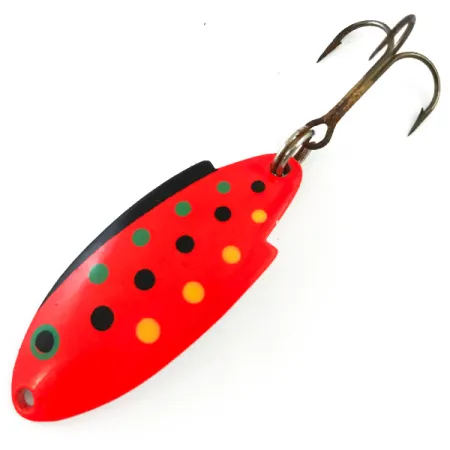 Chiaramente stampigliato sul lato concavo con finitura argentata si trova il classico marchio "THOMAS BUOYANT MADE IN USA", che conferma l'origine americana di questo artificiale. Con un profilo di 1 3/4" (4,5 cm), questo esemplare pesa 1/4oz (7 g), rappresentando un'opzione versatile per il lancio con attrezzatura leggera. La finitura è il vivace motivo Red Trout UV Glow, una base audace arancio-rossa fluorescente decorata con una serie di punti verdi, neri e gialli. Identificato dal codice prodotto 5393, l'ondulante presenta una verniciatura specializzata che reagisce alla luce UV per migliorare la visibilità in ambienti con scarsa illuminazione. La componentistica include l'ancoretta originale color bronzo fissata tramite un anello spaccato all'estremità della coda svasata. Osservando lo stato di conservazione, presenta una valutazione di 5/5 con una finitura liscia e lucida su tutto il corpo metallico.
