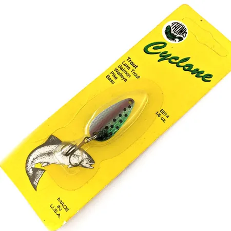 Stampato a mano negli USA, il corpo metallico di questo Thomas Cyclone pesa 1/8 oz (4,3 g) e misura 1 1/2" (4 cm). La finitura Rainbow Trout presenta un classico motivo a puntini su una sfumatura dal verde al rosa, ideale per imitare il pesce foraggio di specie come salmone e trota lacustre. Identificato dal codice 11694, questo artificiale è inutilizzato e sigillato nella sua confezione originale su cartoncino giallo. L'armamento prevede un singolo amo triplo bronzato collegato tramite un robusto anellino spaccato. I Thomas Spinning Lures sono noti per la qualità costruttiva, e questo esemplare rappresenta un chiaro esempio della tradizione manifatturiera americana.